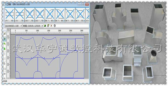 武漢華宇誠數控生產的通風管道數控等離子切割機,針對風管展開切割進行了專門優化。切割速度更快、切割精度更高、切割效果更好。并搭配專門的風管展開軟件,用戶只需選擇要切割的風管類型,輸入相應尺寸參數,便可自動排料、自動生成加工程序,用戶直接用U盤在切割機上調入加工程序切割即可。